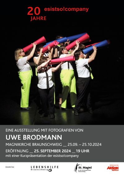 Der Braunschweiger Fotograf Uwe Brodmann begleitet die esistso!company, das Tanztheater der Lebenshilfe Braunschweig, fotografisch bei ihren Proben und Aufführungen. Seine Arbeiten dokumentieren die künstlerische Entwicklung der Company aber auch die Fortschritte der einzelnen Tänzer, seine Fotografien von diesen besonderen Menschen erhöhen die Sichtbarkeit des Ensembles in der Öffentlichkeit. Nach zwanzig Jahren ist die esistso!company aus der Braunschweiger Kulturszene nicht mehr wegzudenken. Anlässlich von "20 Jahre esistso!company" ist im Chorraum der Braunschweiger Magnikirche eine Auswahl von großformatigen Fotografien zu sehen.