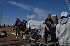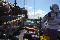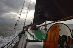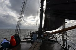 Nach grüppchenweisem Frühstücken auf hoher See wurde der Wind so stark, dass wir den Hafen mit 12 Knoten einige Zeit früher erreichten als geplant, und noch Zeit zum Packen und Dienste-erledigen hatten. Obwohl wir von heftigem Platzregen empfangen worden waren, gingen einige im anschließend freundlicheren Wetter noch einmal in die Stadt. Kurz vor Abreise verabschiedeten wir Herr- und Frau Kapitän mit einem selbstgebackenen Kuchen, und Marco wurde von Henning ein Pullover für seine Sammlung überreicht.